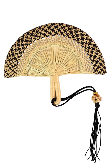 andwoven from natural iraca palm, this fan pairs classic beige tones with bold black accents for a refined, minimalist look. It brings understated sophistication to warm days, evening outfits, and curated interior spaces
