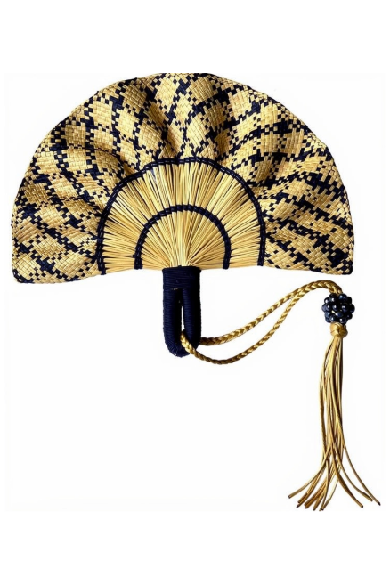 Handwoven from natural iraca palm, this fan blends organic beige tones with deep blue accents, creating a timeless coastal look. —perfect for warm days, beach-inspired outfits, and serene interior spaces.